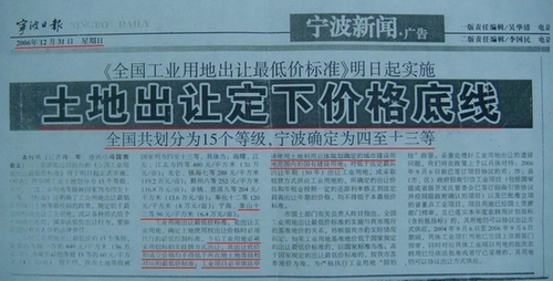 此文件同时规定,既便按照规划区以外的工业用地地价,也不能低于国土资源部规定的第十三等次价即96元/平方米,按此标准每亩工业用地应为64000元。