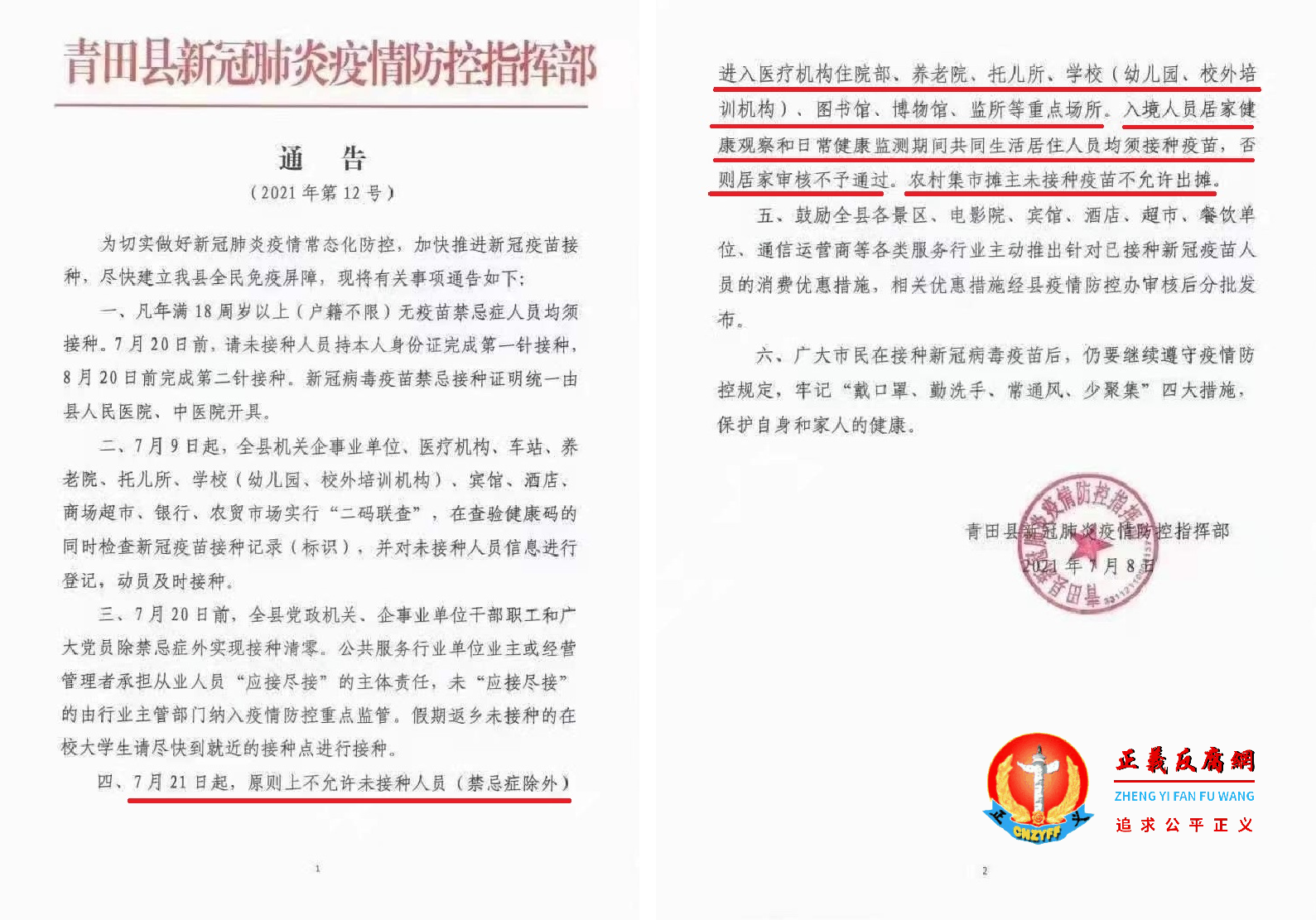 ▲地方违法出台相关文件进行强制或变相强制接种,青田县新冠肺炎疫情防控指挥部《通告》文件中称“原则上”(2021年第12号)(图片来源于微信公众号“青田发布”截图)