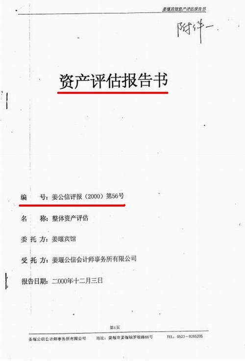 原政府招待所于2000年12月4日进行了整体资产评估,截止2000年9月30日创造的总资产为6928.96万元。负债4267.62万元,净资产为2661.33万元(见附件)。而法院民事裁定书上(见附件)截止2001年4月30资产总计2787.14万元,负债4340.59万元。从评估和法院裁定的时间间隔来年,短短七个月的时间,我们的总资产就流失4141.62万元?这显然不是事实,其中必有猫腻,用非法的评估,让“资不抵债”成为事实,难道这就是阳光政府的“阴谋”?